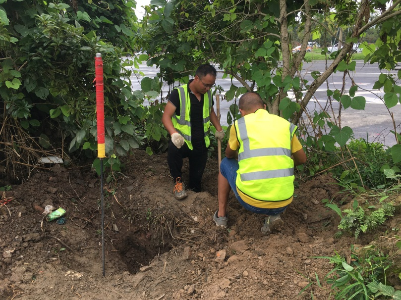對于復(fù)雜的管線,特別是多種管線交錯,儀器探測信號弱、干擾信號強(qiáng)的地方,在土質(zhì)界面環(huán)境中,可以采用打孔棒直接打入地下尋找管道,避免地面大面積開挖,造成環(huán)境破壞。