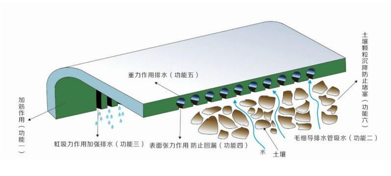 本產(chǎn)品采用PVC高密度聚合材料,具有較好的韌性,埋于土中可以起到拉結(jié)土壤的作用(功能一);且一反傳統(tǒng)改采用密集溝槽,內(nèi)大外小的設計,且埋設時溝槽面向下,而使水流由下往上倒吸進入毛細導水管(功能二);如此一來土壤顆粒因重力自然沉淀不致隨同水流進入毛細導水管內(nèi),同時也不會在進水槽溝附近產(chǎn)生淤積現(xiàn)象(功能三);但是內(nèi)部溝槽既能進水,同時也造成漏水之后果,此時毛細防排水板則利用表面張力使水在溝槽上產(chǎn)生封閉效果不回漏(功能四);當水進入時,毛細現(xiàn)象會自然而然對土壤中的水分產(chǎn)生抽吸的效果,直到灌滿并以重力流向外排放(功能五);當水流到達出口將因落差產(chǎn)生虹吸作用,進一步對土壤內(nèi)部產(chǎn)生負壓,大幅增加吸排水效果(功能六)。