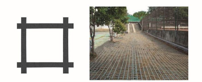 鋼塑復(fù)合土工格柵是用聚丙烯、聚氯乙烯等高分子聚合物經(jīng)熱塑或模壓而成的二維網(wǎng)格狀或具有一定高度的三維立體網(wǎng)格屏柵。由于塑料土工格柵在制造中聚合物的高分子會(huì)隨加熱延伸過(guò)程而重新排列定向,加強(qiáng)了分子鏈間的聯(lián)結(jié)力,達(dá)到了提高其強(qiáng)度的目的。其延伸率只有原板材的10%~15%。如果在土工格柵中加入炭黑等抗老化材料,可使其具有較好的耐酸、耐堿、耐腐蝕和抗老化等耐久性能。
